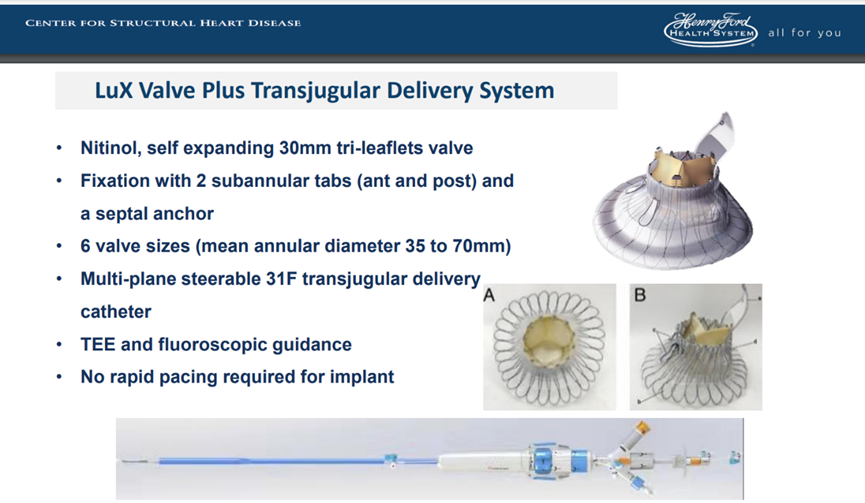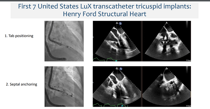 Dee Dee Wang教授隨后分享了Henry Ford Hospital前7例LuX-Valve Plus的植入經(jīng)驗(yàn),并提示術(shù)中確定瓣葉夾持鍵的位置處于三尖瓣瓣環(huán)下方(右心室側(cè)),以及室間隔固定片與室間隔的相對(duì)位置關(guān)系是最關(guān)鍵的兩個(gè)步驟。通過經(jīng)胃底短軸切面,配合右室流入/流出道切面的X-plane就能較容易地獲取相關(guān)影像。由于LuX-Valve Plus對(duì)超聲影像的要求較低,手術(shù)過程簡(jiǎn)單易操作。