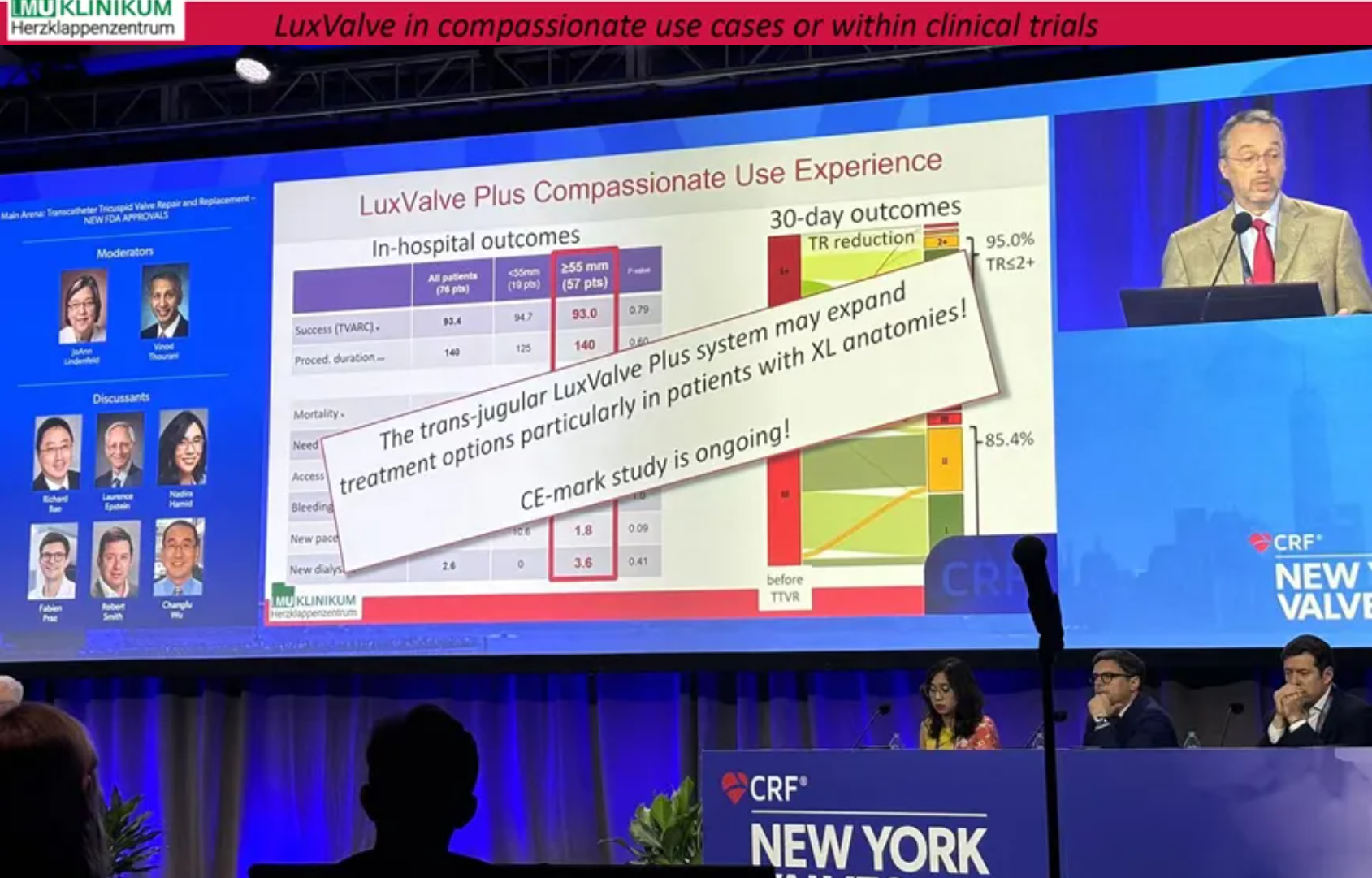 隨后在2024年紐約瓣膜會上,Hausleiter教授再次提及LuX-Valve Plus,并介紹到對于不適合做T-TEER術式的患者也是適用的,并且能夠擴大治療方式的選擇,例如瓣口接合有較大缺陷和超大瓣環的患者,以及超聲影像質量較低不適合夾子術式等情況。Hausleiter教授表示LuX-Valve Plus展現了優異的的早期臨床表現。