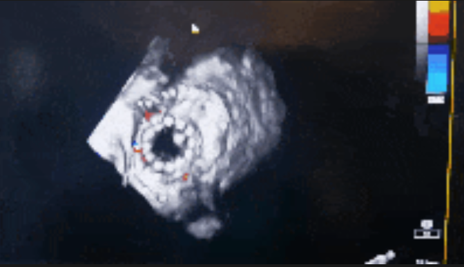 術中經食道超聲輔助下可見LuX-Valve Plus夾持件順利抓捕瓣葉,室間隔錨定位置良好,假體瓣膜整體錨定狀態穩固。