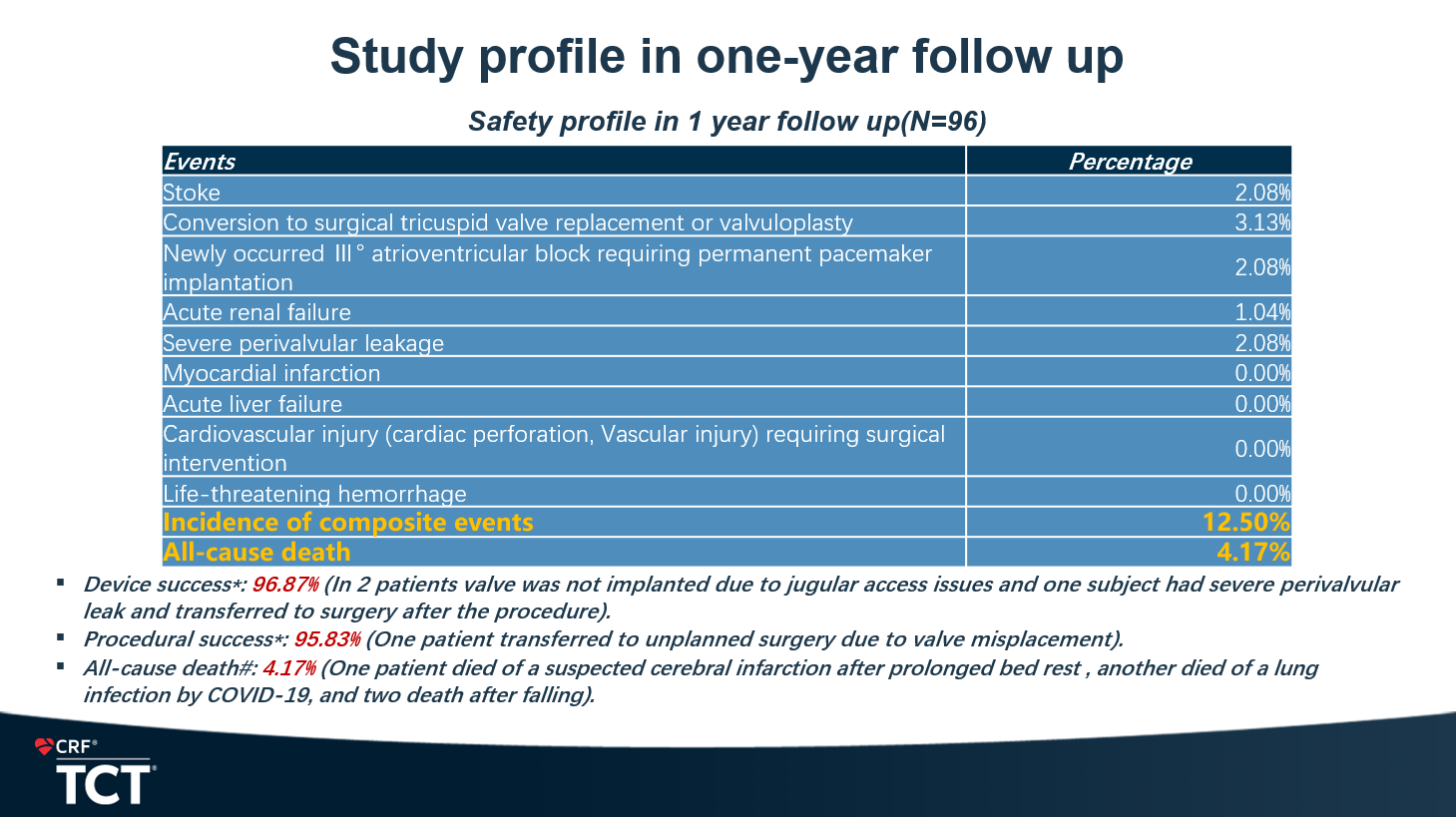 安全性結果顯示,復合事件發(fā)生率為12.50%。心梗、使用ECMO(體外膜肺氧合)或IABP(主動脈內(nèi)球囊反搏)、急性肝功能衰竭、長期機械通氣(>72小時)、需要外科干預的心血管損傷(心臟穿孔、血管損傷)、危及生命的大出血事件發(fā)生率均未發(fā)生。全因死亡率僅為4.17%,急性腎臟衰竭、重度瓣周漏和中轉外科三尖瓣置換或成形術發(fā)生率分別為1.04%、2.08%和3.13%。新發(fā)III度房室傳導阻滯需植入永久心臟起搏器的發(fā)生率僅2.08%。