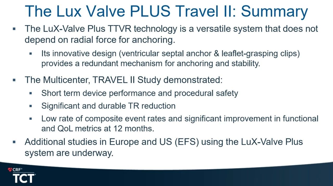 Granada教授表示,LuX-Valve Plus 是一款不依賴于徑向支撐力固定的多功能 TTVR 器械,它的創(chuàng)新設計(室間隔錨定和瓣葉夾持件)提供了多樣的固定和穩(wěn)定技術。多中心臨床試驗研究 TRAVEL II 展現(xiàn)了 LuX-Valve Plus 的安全性和有效性,能實現(xiàn)較短的器械操作時間,較低的復合事件發(fā)生率。1年期的數(shù)據(jù)延續(xù)了6個月數(shù)據(jù)的優(yōu)異結果,顯示了其長久的可靠性,尤其是1年期時顯著降低三尖瓣返流等級,以及帶來心功能和生活質量等指標的明顯改善。